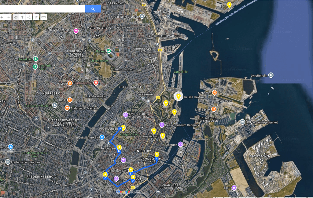 En el mapa que te dejamos a continuación, los símbolos amarillos marcan los imprescindibles que visitamos durante nuestra ruta por Copenhague, mientras que la línea azul indica el recorrido a pie que hicimos entre los distintos puntos del centro histórico.